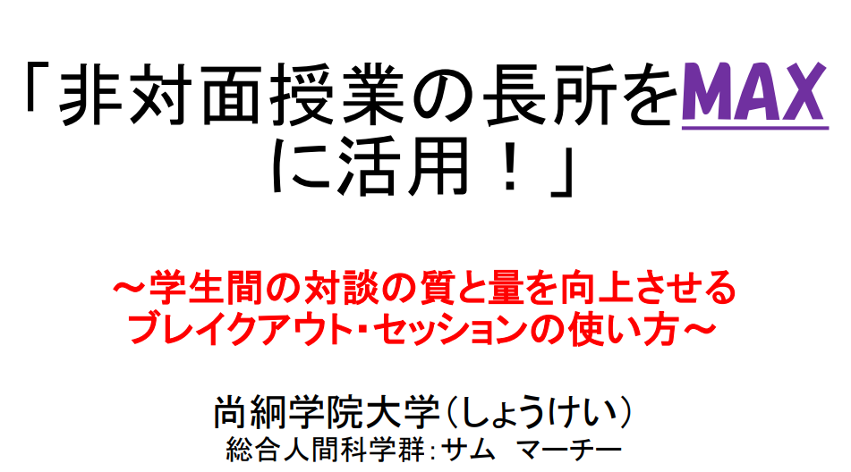 コロナの真っただ中で、非対面授業の良さ、非対面に慣れるための教員マインドセットの二つを中心に発表しました。